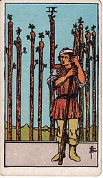 9 of wands shows strength, resilience, hope, honesty, good judgement, and success.
