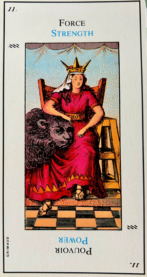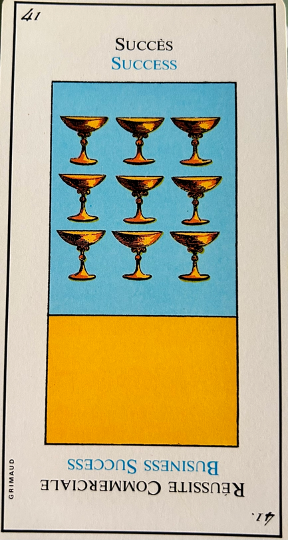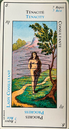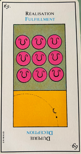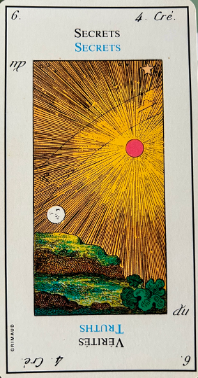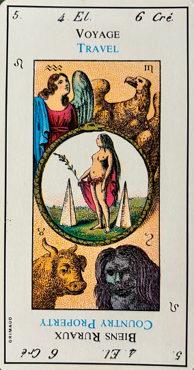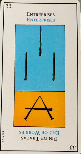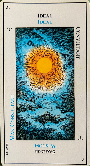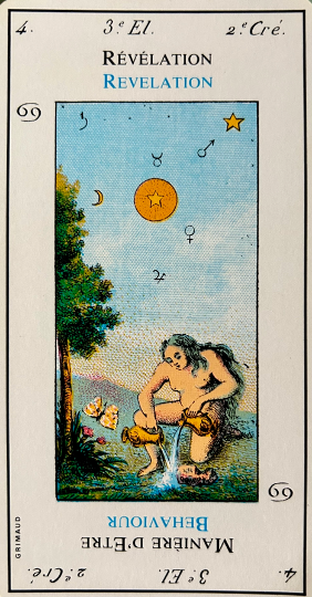 Very important; this card is the emblem of success in love as well as in work. It corresponds to 21, the world and the sixth biblical creation story, that of the creation of beasts and man. In the margin are the symbol for leo, the sixth day of creation in the bible and the fourth alchemical element – water.