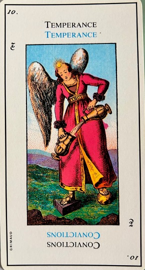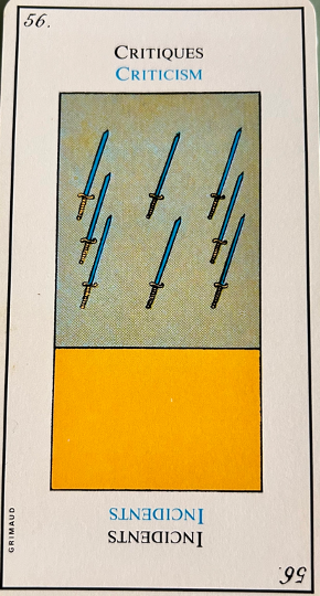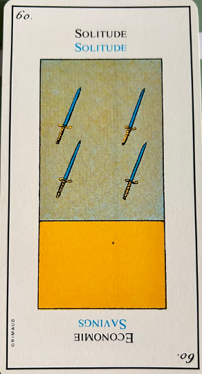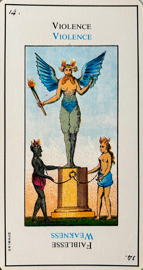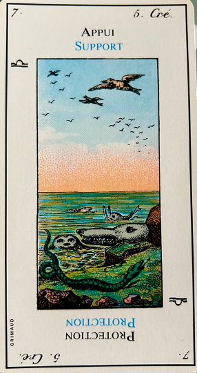 Although this card provokes hostility, it is not always bad for it also gives help and protection. It corresponds to 4, the emperor and the creation story of the sea and birds. In the margin are the symbol for libra and the fifth day of creation in the bible.