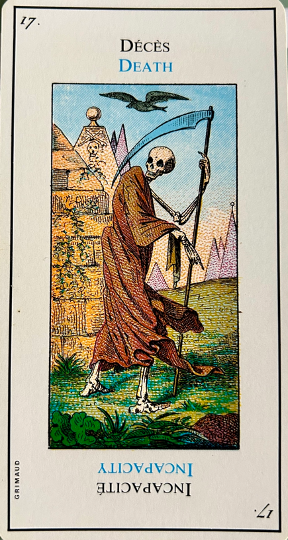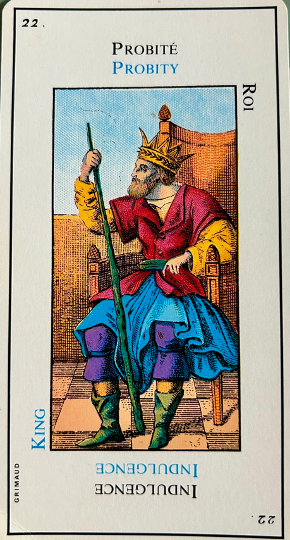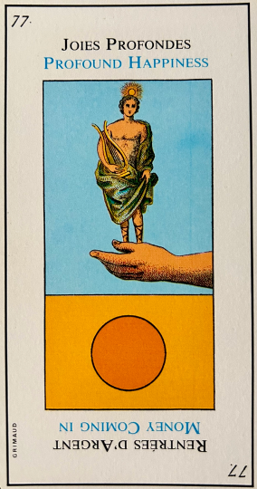 “The GREAT ETTEILLA or EGYPTIAN TAROTS is not an ordinary game of divination. Its cards show mystical and allegorical symbols that go back to remote antiquity. According to transmission by word of mouth and old manuscripts these cards were first created by Egyptian priests in the time of the Pharaohs, they then appeared as illustrations in that great book called the Cabbala, and after that we find they were used by the Bohemians at the time of the Middle-Ages, then rediscovered in the nineteenth century and put into circulation by the famous playing-card manufacturer, Grimaud and finally to-day we have these cards perfected and clearly explained by experts in the playing-card manufacturing firm of J.-M.Simon. The GREAT ETTEILLA – owing to the centuries devoted to experimental methods on how to draw the cards, weaves together earthly materialism with its joys, hardships, worries and celestial spiritualism which hold the facts of our destiny that no human power can change. These cards therefore are a precious guide for all those who practise the Art of Divination as a profession and also for others who wish to have a clearer view of life.
