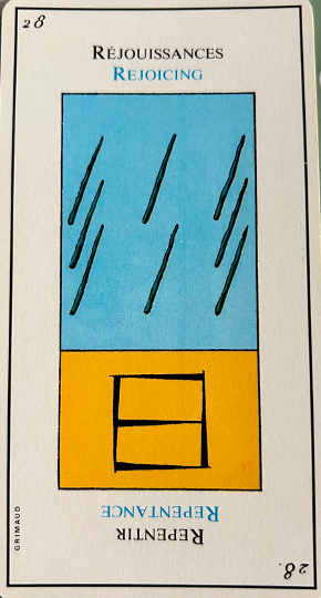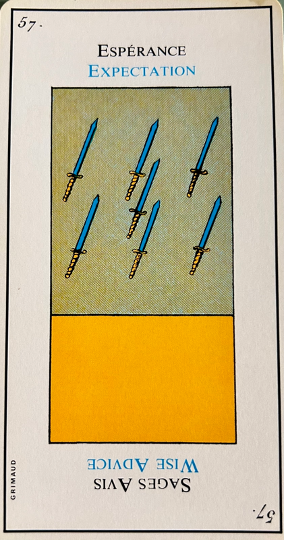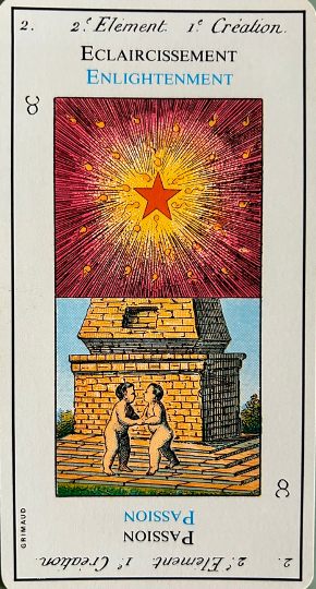 Usually, from all points of view this card signifies loss, especially when it is the right way up. Nevertheless, it brings enough lucidity to face events. It corresponds to 17, the star and the second biblical creation story, the firmament to divide the waters from the waters. In the margin are the symbol for cancer, the second cay of creation in the bible and the alchemical element Fire.