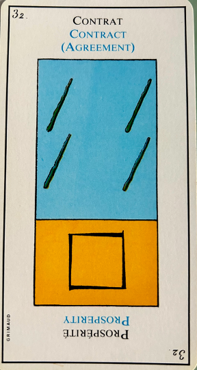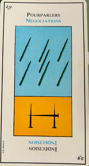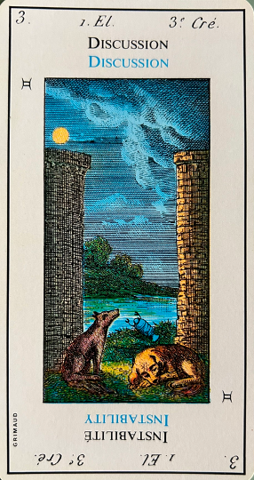 This card signifies negotiations and talks. The accompanying cards influence the extent of these negotiations and talks. It corresponds to 18, the moon and to the biblical story of the seas, dry land and the plants that grow. In the margin are the symbol for gemini, the third day of creation from the bible and the first alchemical element – Air.