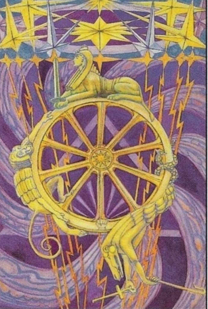The ten of discs is called wealth, here again is the recurring doctrine that as soon as one gets to the bottom one finds oneself at the top. When wealth accumulates beyond a certain point it becomes inert unless intelligence is used to determine its best use. This card is to the small cards what the universe is to the trumps.