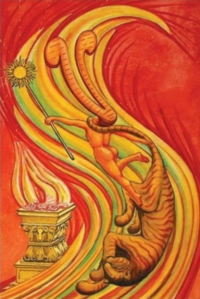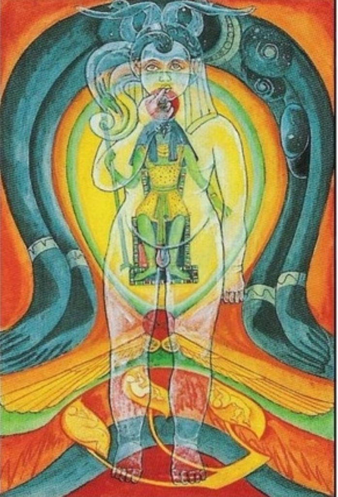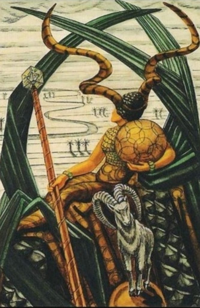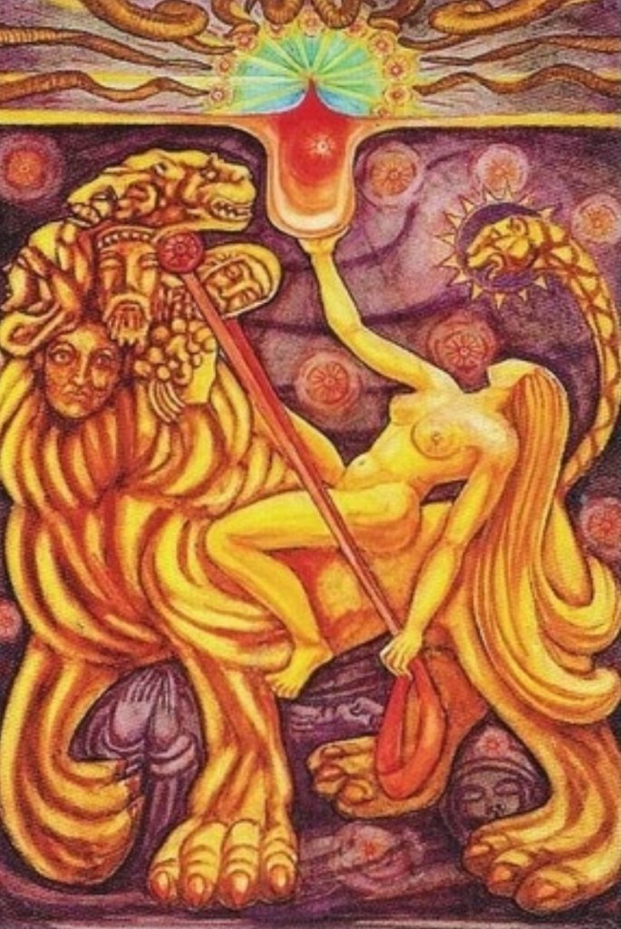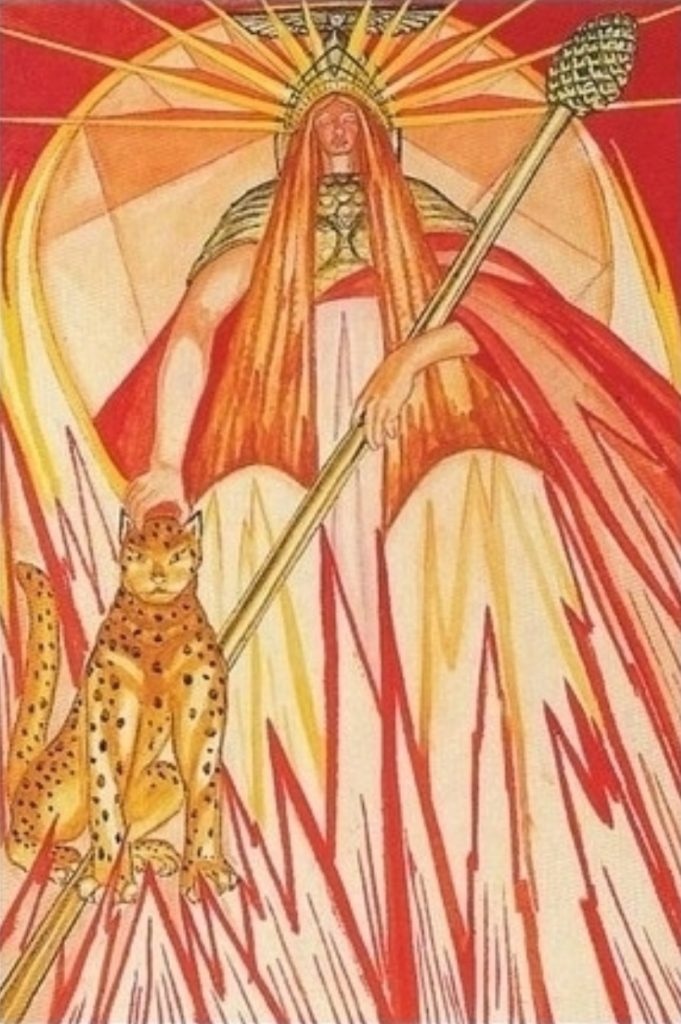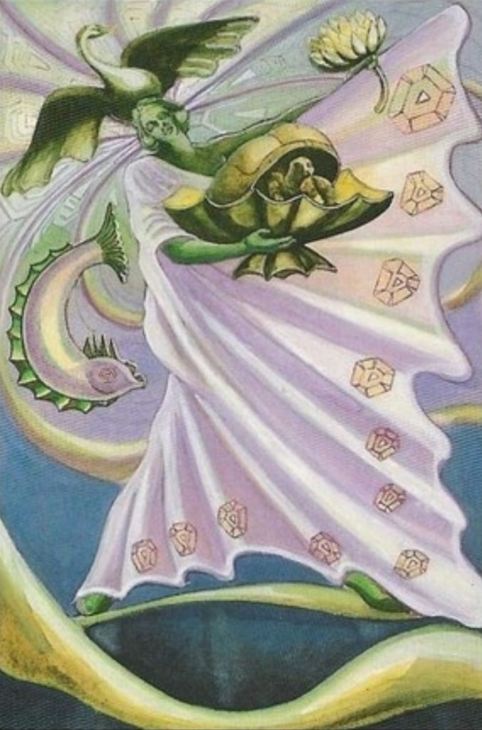 The woman/child depicted in the card is stated by Crowley to be so beautiful and glorious that of all the visions and glories he witnessed “there is not one which is worthy to be compared with her littlest fingernail.” Her name is not to be spoken, thought is smitten dead before her, there are no words to conjure her nor adorations to praise her. Upon the combs in her hair are the names of the seven secret gods, names unknown to the angels, archangels, and the leader of the armies of the lord. He finishes “Holy, holy, holy art thou, and blessed by thy name forever, unto whom the aeons are but the pulsings of thy blood.”
