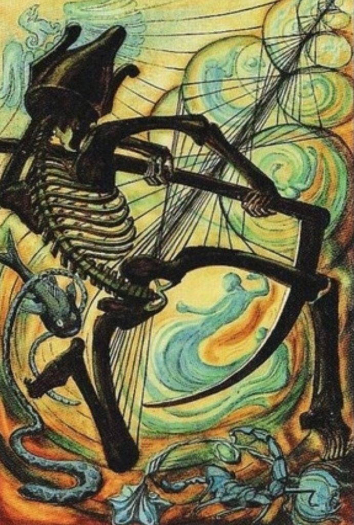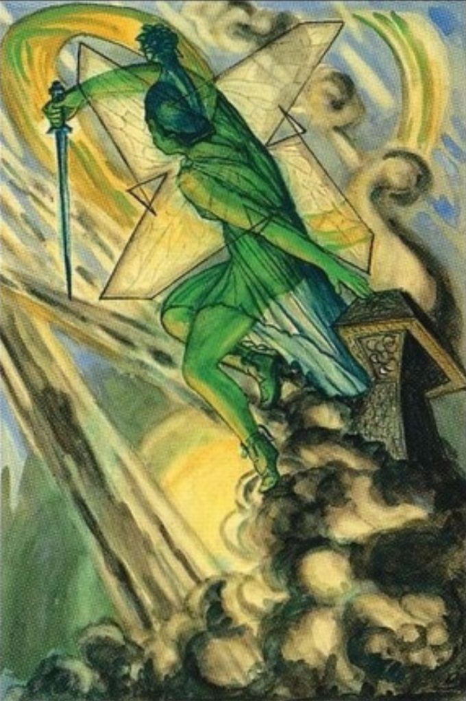 In keeping with his belief that this card deck has been updated for the new Aeon, Crowley has departed completely from the traditional judgement card and replaced it with Aeon. The judgment card heralded judgement day where the dead rose from their graves after being awoken by the horn of Gabriel. Crowley believed that the world was destroyed by Fire in 1904 when Horus took the place of Osiris in the position of the hierophant. Thus, this card shows the angel bringing news of the new Aeon to Earth. The body of Nuith drapes around the top of the card and her mate, Hadit, is shown in the globe of fire representing eternal energy. It is as a result of their marriage that their child Horus is born only now, he is to be known as Heru-ra-ha. This indicates he is a double God, both extroverted and introverted. Crowley suggests that a study should be made of the Book of the Law to further understand this symbolism – it’s on my reading list but for now, I can’t offer any further insight, sorry! He points out that Heru is also Hru, the great angel set over the tarot. There is allusion to the next aeon in the sign of Libra which will be the fall of the Great Equinox. Crowley speculates that from looking at 500 years either side of the start of the previous Aeon that it is likely we are currently in another ‘dark age’ but he believed that today we have brighter torches and more torch bearers.