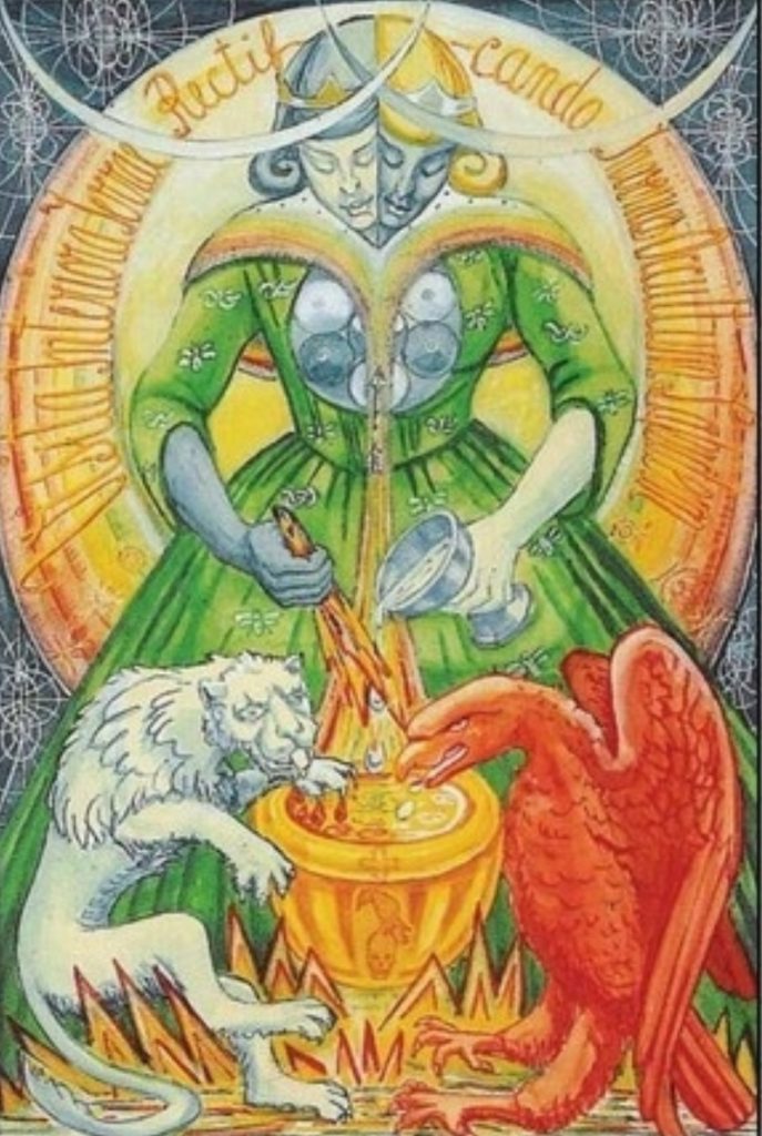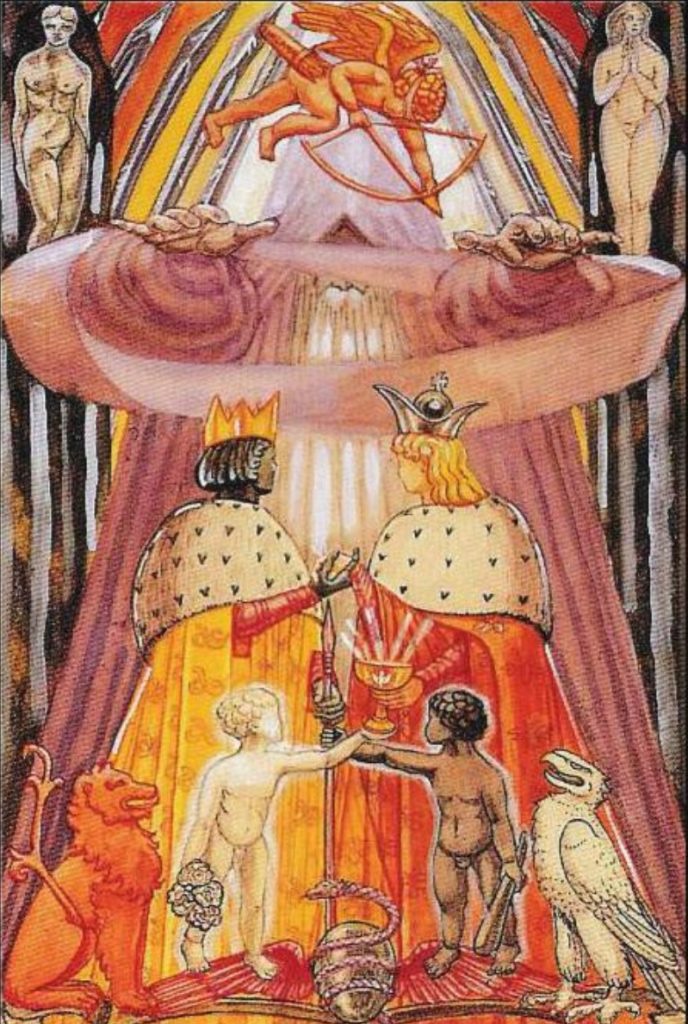 The red lion and white eagle symbolise the male and female principles in nature. The egg represents all life, and its colour shows the cooperation of these male and female figures.