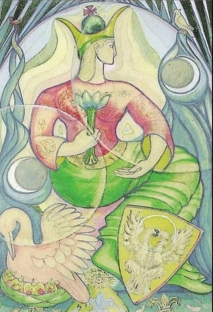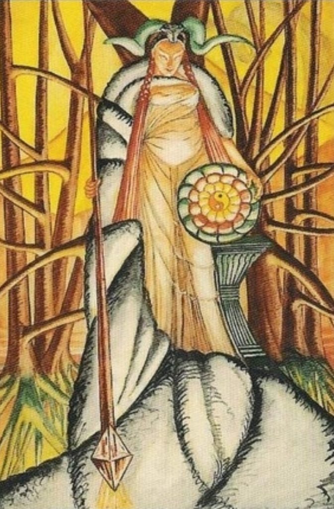 This card refers to the letter gimel, which means camel and refers to the moon – the moon being a feminine symbol, it is a symbol of the second order corresponding to the sun as the yoni corresponds to the lingam. While the two previous cards are concerned with the nature above the abyss, the high priestess is the first to connect the supernal triad – ain, ain soth and ain soth aur – with the hexad, the ten below. She makes the direct connection between the father in his highest aspect and the son in this most perfect manifestation. That she is clothed only in light represents the veil that hides the spirit, she is the truth and she hunts by enchantment. She is potentially the goddess of fertility, the idea behind all form and the influence of the supernal triad below the abyss. Crowley makes particular mention of the three consecutive letters, gimel, daleth and he which show the feminine symbol – yin – in three forms composing the triune goddess. This trinity is immediately followed by the three corresponding and complementary fathers, vau, tzaddi and Yod.
