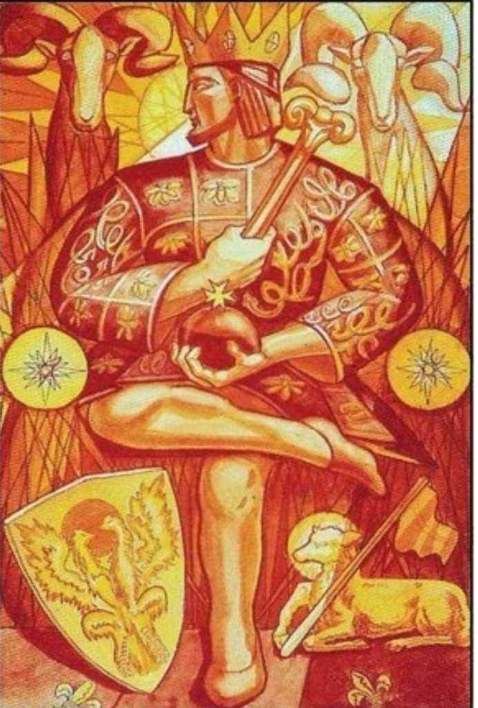 This card is attributed to the letter Tzaddi and refers to the zodiacal sign of Aries, it is therefore a combination of energy in its most material form and authority. The combination of the rams and the lamb shows the wild, courageous, and often lonely nature of the ram contrasted with their docile, cowardly cousin. Crowley calls this the theory of government.