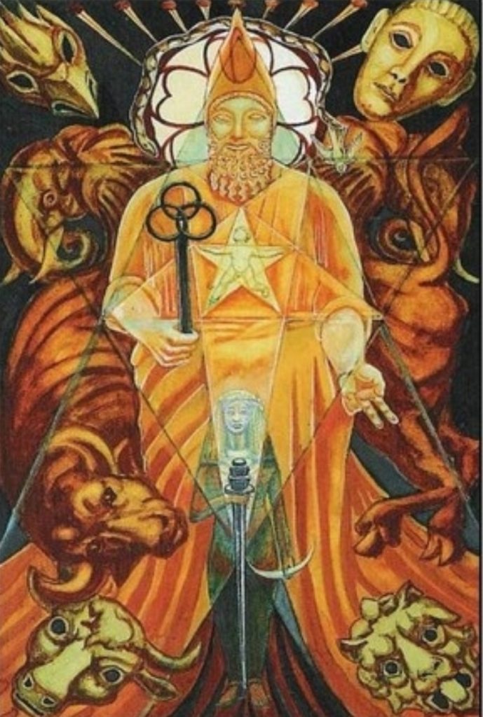 Crowley believed that time can be bracketed into aeons of 2000 years. He believed that we were at the start of a new aeon, the aeon of Horus or the child. Thus, the pentagram at the centre represents the dancing child and symbolises the new aeon. This aeon has supplanted the previous aeon, that of the dying God Osiris, which governed the world for the last 2000 years. He notes that the hierophant’s rhythm is such that he moves only at intervals of 2000 years.