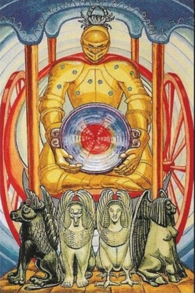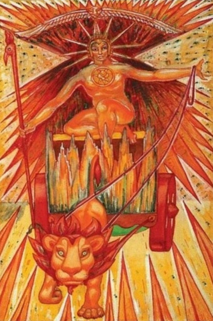 Whew, there’s a lot going on in this one. This card and its twin, 14, art are the most difficult to interpret. This card refers to Gemini, the twins and the corresponding Hebrew letter is Zain which means sword. Together with Art, the lovers compose the comprehensive alchemical maxim solve et coagula – analysis and synthesis, break apart and recombine. According to Crowley, this card shouldn’t be called the lovers but should in fact be called the brothers because it depicts Cain and Abel along with their mother Eve.