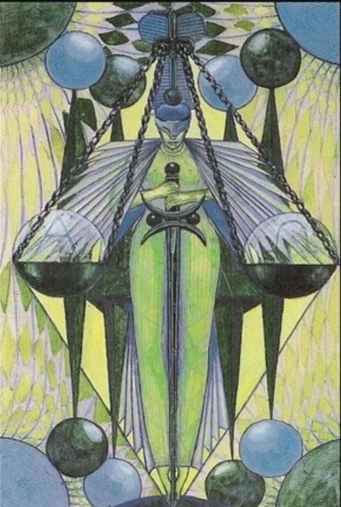 This card is known as justice in other decks, but Crowley argues that there is no justice in nature, that justice is a purely human concept, however, nature IS exact. The card represents Libra, ruled by Venus and in it Saturn is exalted, the equilibrium of all things is symbolised here.