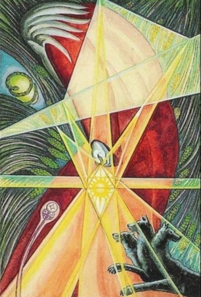 This card is attributed to the letter Yod which means hand, yod is the foundation of all the other letters in the Hebrew alphabet. Yod is the first letter of the tetragrammaton and symbolises the father, the creator of all worlds. In the lamp is the sigil of the king of fire because Yod is the secret fire. He is not only creative but is the fluidic essence of light which is the life of the universe.