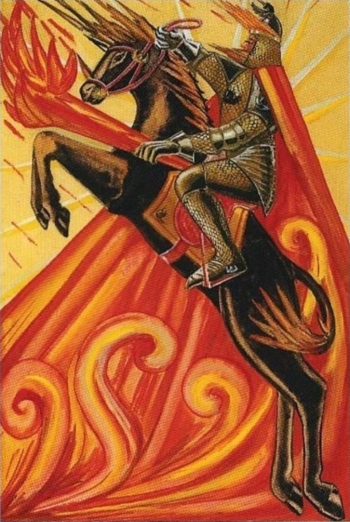 The Knight of Wands represents the fiery part of fire, he is a warrior bearing a flaming torch and riding a leaping black horse. The moral qualities of this figure are activity, generosity, fierceness, impetuosity, pride, impulsiveness and swiftness in unpredictable actions. If wrongly energised, he is evil minded, cruel, bigoted and brutal. If he fails in his first effort, he has no resource. In the I Ching the fiery part of fire is represented by the 51st hexagram, and while the significance is largely in line with the tarot definition, great emphasis is laid on the revolutionary character of the related events. The seeker is advised to keep a cool head and beware of untimely action but go forward with a tense confidence in their own ability.
