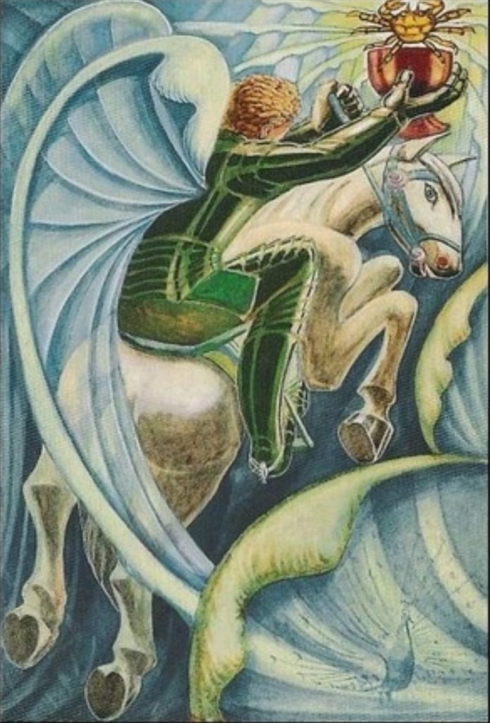 The Prince of Cups represents the airy part of water, on one hand elastic, volatile with the hydrostatic equilibrium and on the other a catalyst and the energy of steam. His armour seems more like a growth than a covering and his wings are almost gaseous in reference to volatile power. The moral characteristics of this person and subtlety, secret violence and craft. He is an artist and intensly secretive, superficially he seems calm and unflappable but this is a mask for the most intense passion. He seems receptive to outside influence but he accepts them only to use them for his own advantage. He is without conscience and is often distrusted by people who feel they do no and can not understand him. He is ruthless and cares intensely for power, knowledge and his own aims while feeling no responsibility to others. In the I Ching the airy part of water is represented by the 61st hexagram, one of the most important for it “moves even pigs and fish, and leads to great good fortune.”