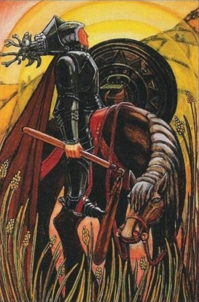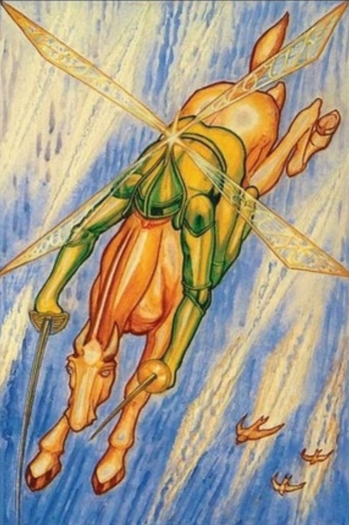 The Knight of Swords represents the fiery part of air, the wind and the storm. He is a warrior riding a maddened steed, he represents the idea of attack. The moral qualities of a person are activity and skill, subtlety and cleverness. He is fierce, delicate and courageous but prey to his ideas which are inspired but without reflection. At worst these qualities are absent, he is incapable of decision and lacks purpose, any action he takes is easily opposed and dismissed. In the I Ching the fiery part of air is represented by the 32nd hexagram which largely aligns with the description given adding perseverance in well doing or continuously acting out the law of one’s being.